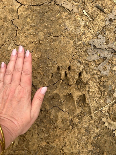 Last week I came across a cougar track while hiking Aetna Mountain in Chattanooga, Tennessee, at the base of the Great Smoky Mountains, sometimes referred to as the Blue Ridge Mountains because they look blue in certain light. Even in our short time there, I saw the blue while viewing from the front porch rocking chair. While hiking on the mountain I literally sang Country Road Take Me Home. So peaceful!